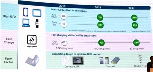 在快速充電方面,三星表示,他們可以在30分鐘內充到整個電池能量的75%,爭取到2017時,30分鐘充到電池容量的80%。...