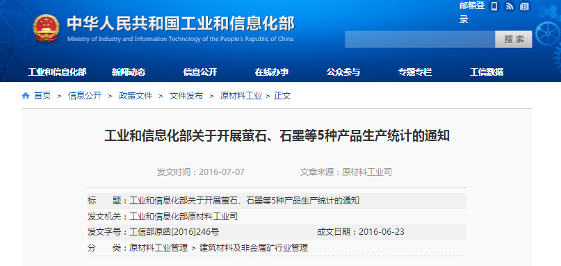 • 工信部關于開展螢石及石墨等5種產品生產統計的通知 日期:2016-07-11 11:39:11 點擊:414 好評:0