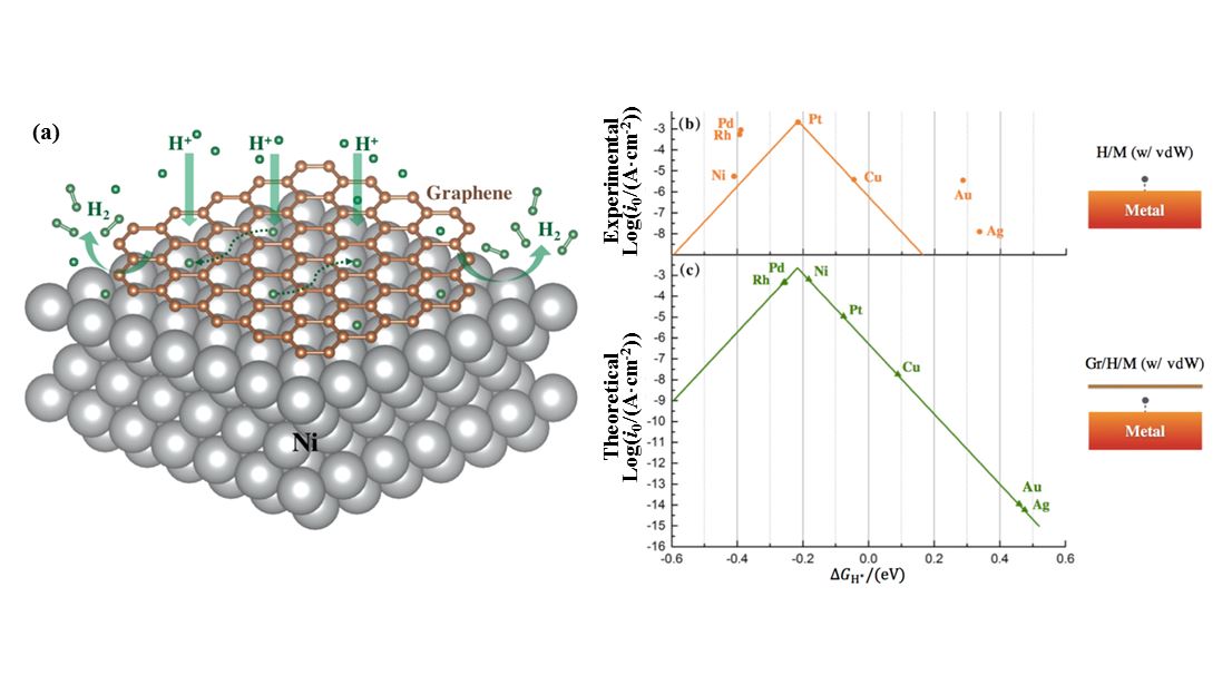 當氫原子位于石墨烯和不同金屬的界面時,其吸附能比在沒有石墨烯覆蓋的金屬上都有一定程度的減弱。特別突出的是,金屬鎳面的吸附能因為石墨烯的覆蓋,其相應的析氫能力被調控到火山型曲線的峰值附近,成為具有高催化活性的催化劑材料。...
