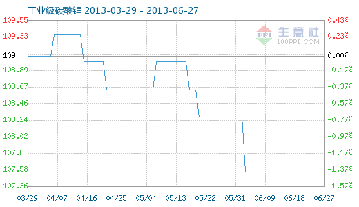 6月13日工業(yè)級(jí)碳酸鋰商品指數(shù)為107.55,與昨日持平,較周期內(nèi)最高點(diǎn)112.10點(diǎn)(2012-11-04)下降了4.06%,較2012年01月05日最低點(diǎn)98.94點(diǎn)上漲了8.70%。(注:周期指2011-09-01至今) 工業(yè)級(jí)碳酸鋰商品指數(shù)...