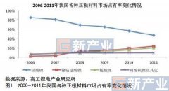 隨著我國下游需求的不斷增大, 正極材料 的市場份額也在不斷擴大,據(jù)高工鋰電產(chǎn)業(yè)研究所(GBII)數(shù)據(jù)統(tǒng)計顯示,中國正極材料產(chǎn)量2011年中國正極材料產(chǎn)量占全球總產(chǎn)量71800噸的49.3%,達35400噸;鈷酸鋰、三元材料、錳酸鋰和磷酸鐵鋰及其它材料的產(chǎn)量分別是18150噸、8500噸、6150噸和2600噸。 2011年中國正極材...