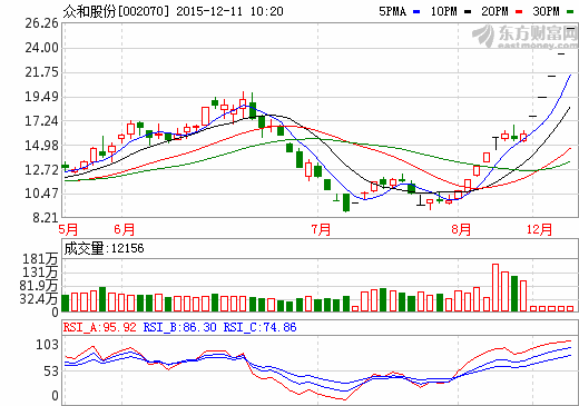 二級(jí)市場上,眾和股份8月3日10.70元漲停收盤,之后連續(xù)四個(gè)交易日漲停,休整三天后,8月12日再次大漲3.36%后停牌。12月7日復(fù)牌,截止到12月10日已經(jīng)連續(xù)四個(gè)漲停板,10日收盤23.43元。12月11日早盤,眾和股份再次巨量封上漲停,25.77元,離歷史高點(diǎn)僅差0.03元。...